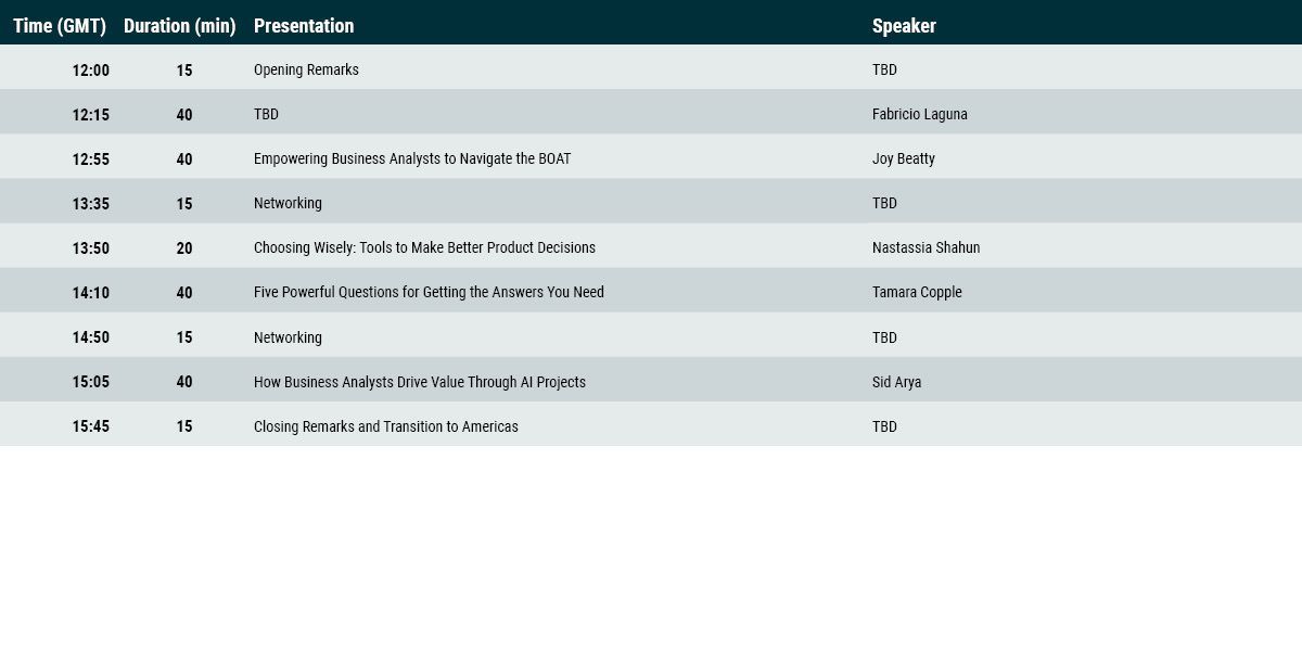 Level up your business analysis skills with Europe’s expertly crafted agenda. Join this region's stream to make smarter product decisions, ask sharper questions, and drive measurable value through AI initiatives. Each session offers tools and insights you can apply immediately toward better business outcomes.